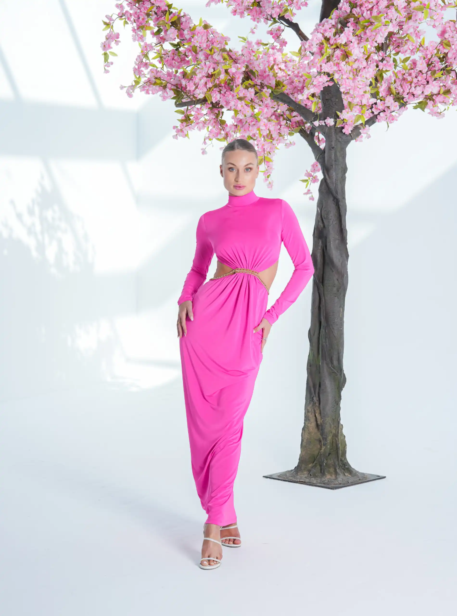 A long dress with an open waist and cowl neck adorned with a dahabi necklace
