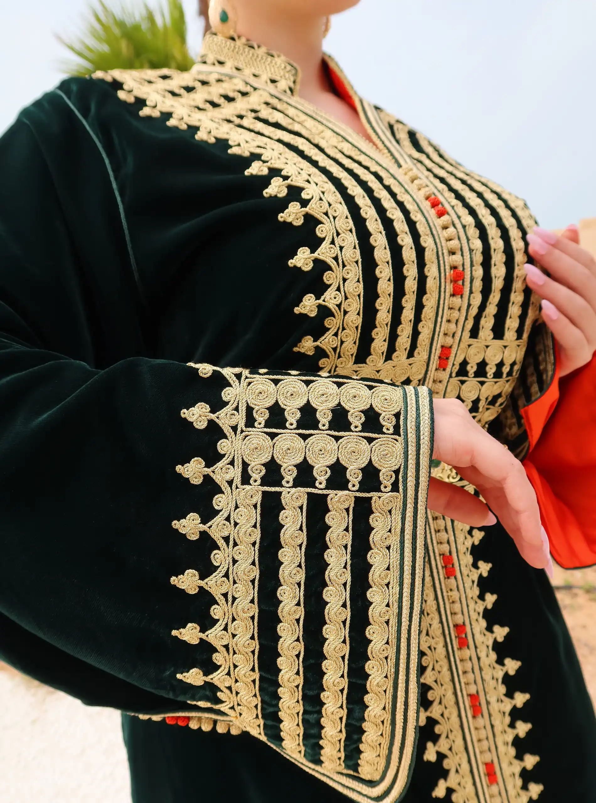 This velvet caftan in dark green, a traditional yet elegant piece with intricate embroidery, radiates style and charm. Its graceful silhouette and luxurious detailing make it ideal for special occasions, formal celebrations, and festive gatherings.