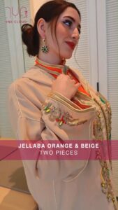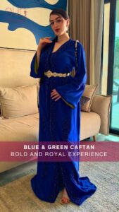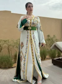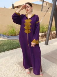 A long dress with an open waist and cowl neck adorned with a dahabi necklace